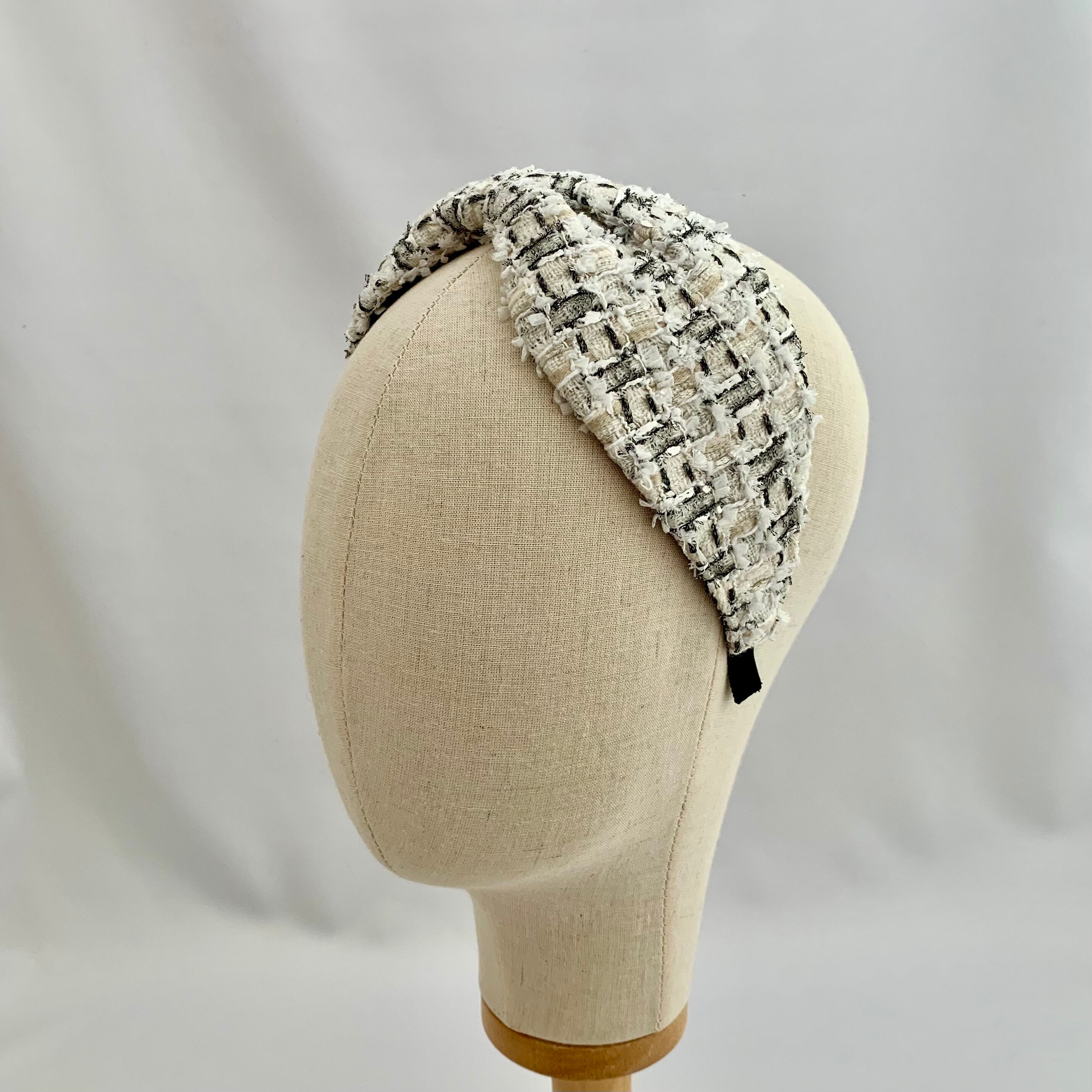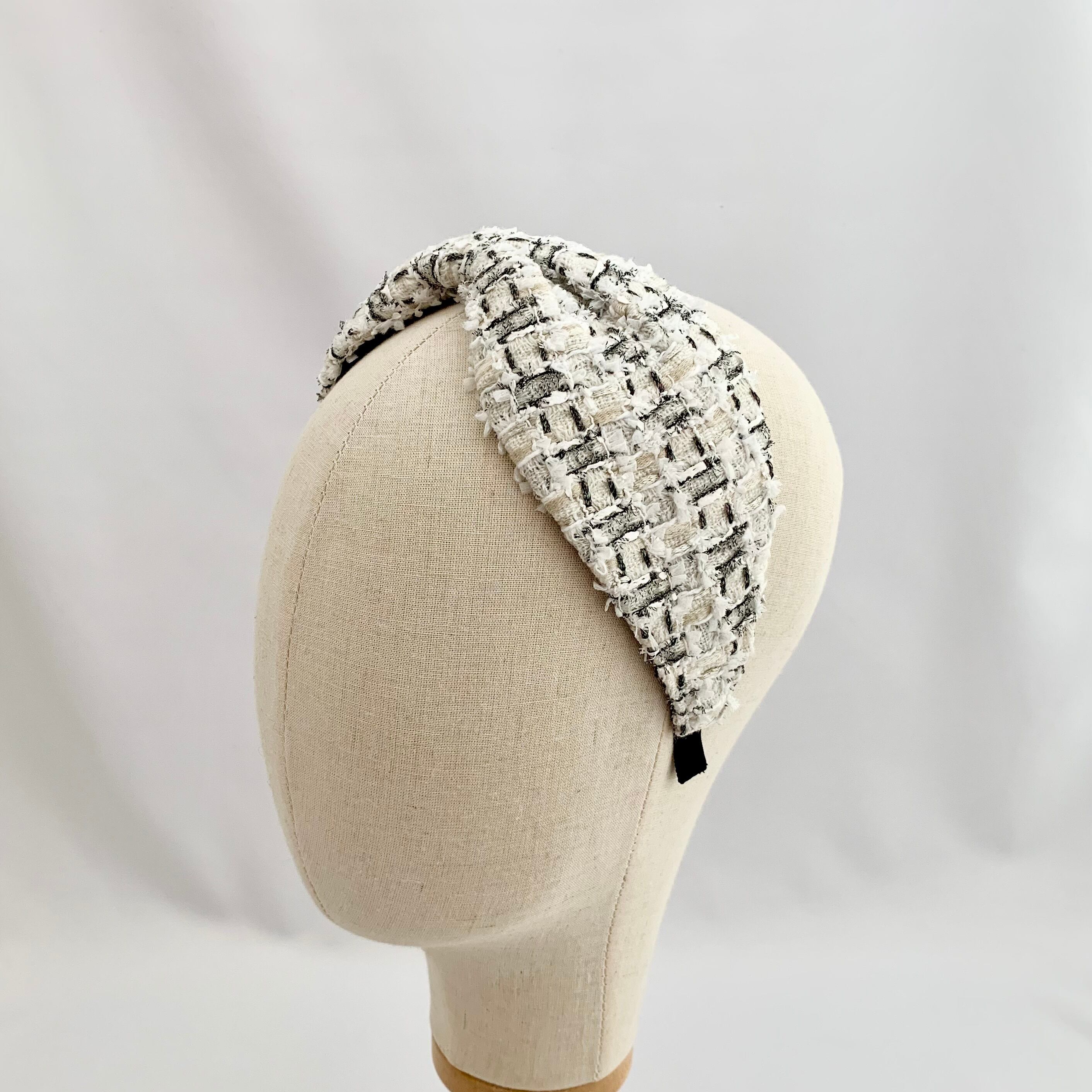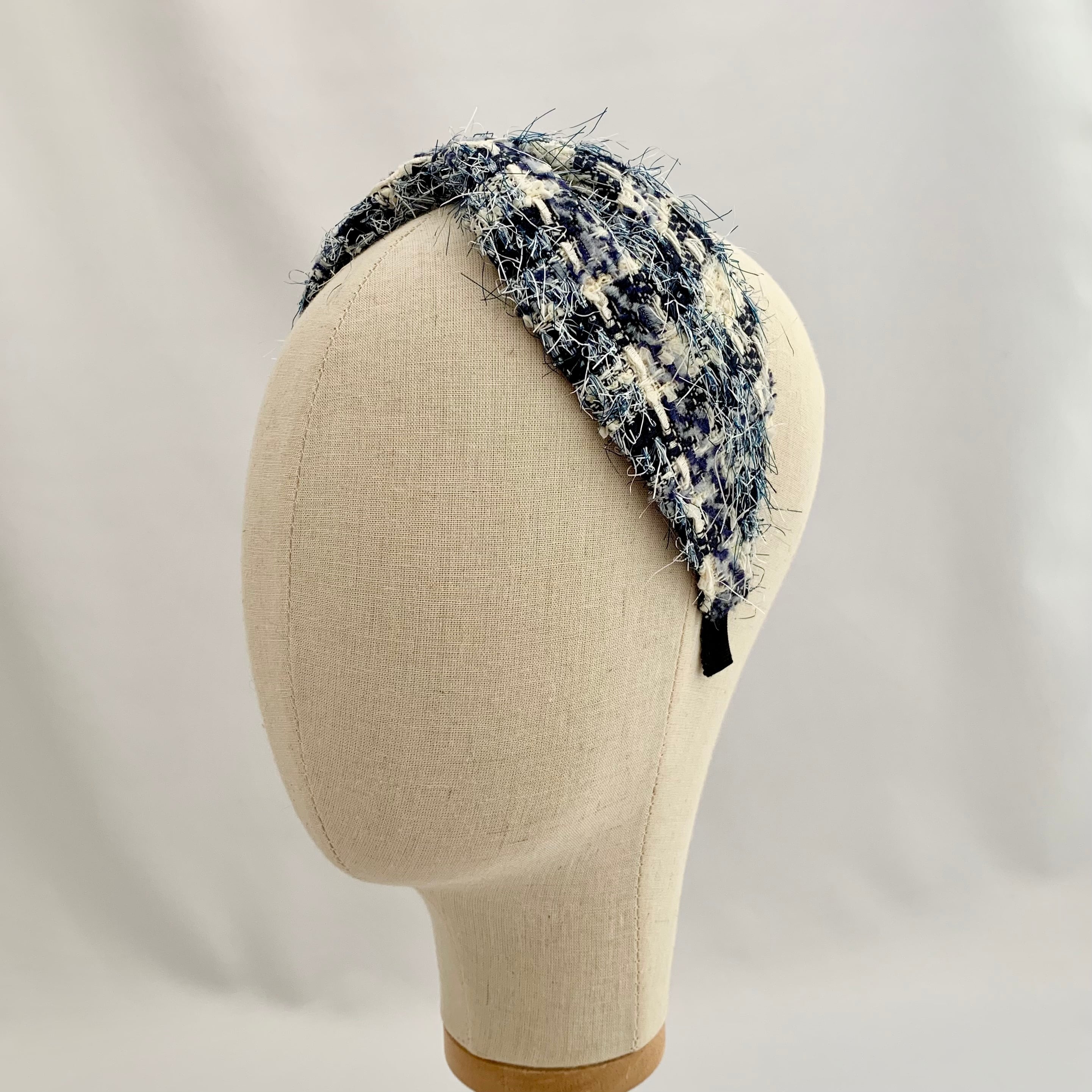 上質なリントンツイードを使用した、エレガントなカチューシャです。洗練されたデザインにリボンがアクセントとなり、特別な装いを引き立てます。柔らかな素材感で頭にフィットし、長時間の着用でも快適なつけ心地です。カジュアルからフォーマルまで、様々なスタイルに合わせることができます。